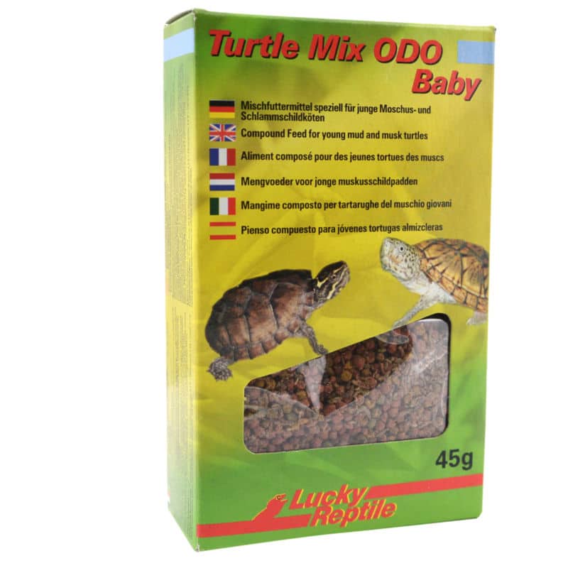 Schlammschildkröten, zu denen auch Moschusschildkröten gehören, bevorzugen grundsätzlich eine carnivore Ernährung und suchen diese Nahrung am Boden und an der Wasseroberfläche. Entsprechend gibt es mit Turtle Mix ODO ein spezielles Futter für Moschus- und andere Schlammschildkröten, das einen hohen carnivoren Anteil aufweist und zusätzlich zu den Pellets im getrocknete Regenwürmer (Turtle Mix ODO Adult) bzw. getrocknete Mückenlarven (Turtle Mix ODO Baby) enthält, um dem Jagdverhalten der Tiere zu entsprechen. Natürlich wurde auch die Pelletgröße entsprechend an die Bedürfnisse von adulten und Jungtieren angepasst. Wir empfehlen die Fütterung von Turtle Mix ODO Baby bis zu einem Alter von ca. 12 Monaten. Danach können die Tiere auf Futter für adulte Tiere umgestellt werden. Moschusschildkröten sollten abwechslungsreich ernährt werden.