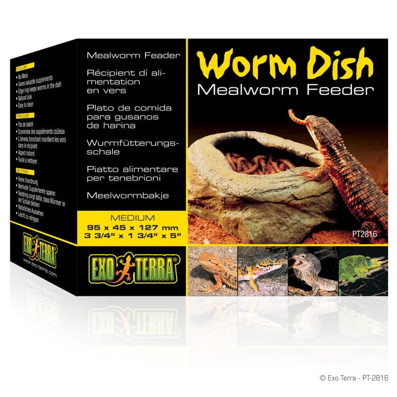 Mehlwürmer müssen zurückgehalten werden, wenn sie in ein Terrarium gegeben werden. Andernfalls werden sie schnell „entkommen“ und sich ihren Weg durch das Substrat bahnen. Sie halten sich sicher versteckt bis die Metamorphose vollzogen ist und sie zu einem ungenießbaren Käfer geworden sind. Viel eher werden sie einfach sterben und ihre verwesenden Körper werden zu einem Festessen für schädliche Bakterien. Die Exo Terra Wurmfutterschale hindert Mehlwürmer daran zu entkommen; jedoch bleiben sie für die Terrarienbewohner sichtbar.