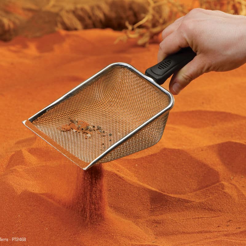 Diese stabile Metallschaufel mit komfortablem Griff hat die perfekte Größe und ist abgewickelt, um leichter damit in die Ecken des Terrariums zu gelangen. Außerdem hat sie ein feineres Netzgewebe, um noch mehr Abfälle zu entfernen.
